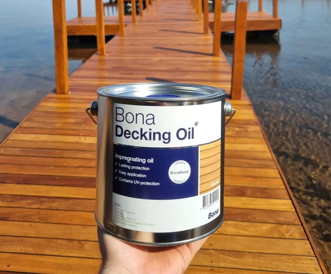 O Bona Decking Oil é o produto ideal para essa etapa. Ele penetra na madeira, repondo nutrientes essenciais e criando uma camada protetora contra: