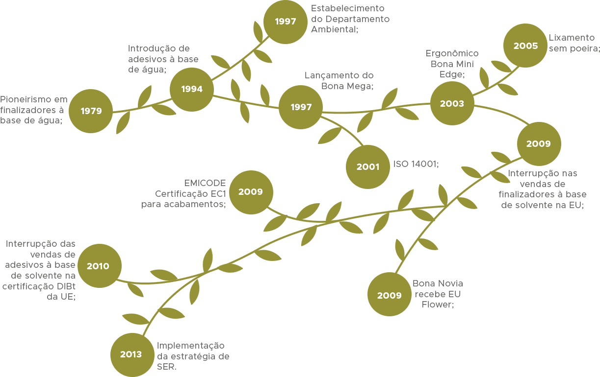 Ao longo dos anos, a Bona vem trabalhando continuamente para lançar os melhores produtos, com menos impacto ambiental. Isso a levou para inovações revolucionárias, desde acabamentos à base d’água, na década de 1970, até o lixamento sem poeira, na década de 2000.