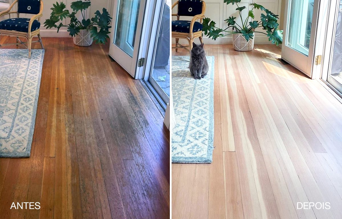 O processo consiste em lixar a madeira para remover todos os danos da superfície, em seguida aplicar um novo acabamento.